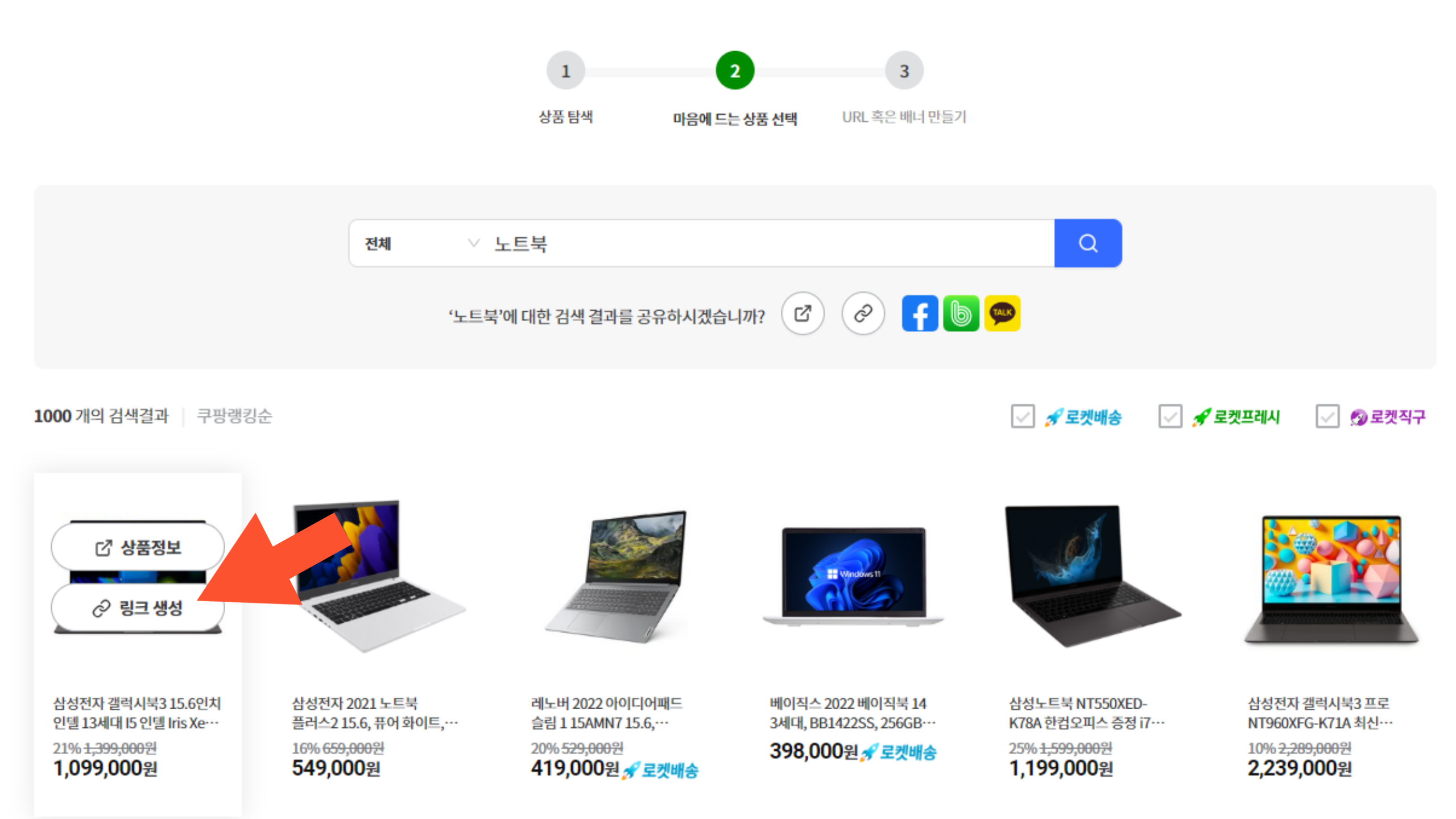 상품을 선택하면, 해당 상품의 링크를 생성하셔야 됩니다.
